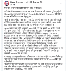 सामाजिक सञ्जाल फेसबुकमा आइतबार बिहान एक लामो स्टाटस लेख्दै उनले लगानीकर्ता एनआरएनएको नाम नखुलाई एक लगानीकर्ताले सम्झौताविपरीत २ करोड ४० लाख रुपैयाँ असुलेको र निरन्तर मानसिक यातना दिइरहेको खुलासा गरेका हुन्।