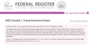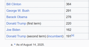 राष्ट्रपति डोनाल्ड ट्रम्पले जनवरी २०१७ देखि जनवरी २०२१ सम्मको आफ्नो पहिलो कार्यकालमा कुल २ सय २० कार्यकारी आदेशहरूमा हस्ताक्षर गरेका थिए । जनवरी २०२५ सम्ममा तीमध्ये ७२ वटा (करिब ३३%) आदेशहरू खारेज भइसकेका थिए । जसमा धेरैजसो आदेशहरू उनी पछिका राष्ट्रपति जो बाइडेनद्वारा रद्द गरिएका थिए । दोश्रो कार्यकाल सन २०२५ जनवरी २० पछिको पछिल्लो तथ्यांक अनुसार अगष्ट २५ सम्म १९२ वटा कार्यकारी आदेशहरुमा हस्ताक्षर गरी सकेका छन । यो संख्या तुलना गर्दा राष्ट्रपति ट्रम्पले अघिल्लो कार्यकालको भन्दा दोब्बर संख्या पुग्न सक्ने देखाउँछ । सन् २०२५ अगष्टसम्म यस्ता कार्यकारी आदेशहरु १४ हजार ३३८ नम्बरसम्म जारी भएका छन । राष्ट्रपति ट्रम्पले दोश्रो कार्यकाल शुरु हुँदा जनवरी २० मा १४ हजार १४७ बाट शुरु भएको नम्बर फेडरल रजिष्टरको आधिकारीक तथ्यांक अनुसार १४ हजार ३३८ मा पुगेको छ । अमेरिकी राष्ट्रपति डोनाल्ड ट्रम्पले पछिल्लो पटक राष्ट्रिय झण्डा जलाउनेलाई कारबाही गर्ने कार्यकारी आदेशमा हस्ताक्षर गरेका हुन । हालसम्मको तथ्यांक केलाउँदा पछिल्लो सात महिनामा लगभग हरेक दिन एक कार्यकारी आदेश भएको देखिन्छ ।