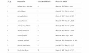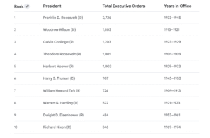 राष्ट्रपति फ्रान्कलिन डी. रूजवेल्टले सबैभन्दा धेरै कार्यकारी आदेश जारी गरेका थिए जुन सख्या ३ हजार ७२१ थियो । अमेरिकी इतिहासमै त्यो एक कीर्तिमान हो । उनको कार्यकालमा कार्यकारी आदेशहरूको प्रयोग अत्यधिक भएको थियो, विशेषत कार्यक्रमहरू कार्यान्वयन गर्न र दोस्रो विश्वयुद्धको व्यवस्थापन गर्न केन्द्रित थियो । ती दुबै समयहरू राजनीतिक र आर्थिक अस्थिरताले भरिएका थिए, जसले कांग्रेसबाट कानुन पारित गर्न कठिन थियो । त्यसैले, उनले कार्यकारी आदेशहरूलाई प्रभावकारी उपकरणको रूपमा प्रयोग गरेको बताईन्छ ।