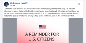 नेपालस्थित अमेरिकी दुतावासले आफ्ना नागरिकहरुमाथी सुरक्षित रहन भन्दै सुचना जारी गरेको छ । दुतावासले आफ्नो फेसबुक पेजमा हाम्रा टोलीहरू नेपालमा र विश्वभर निरन्तर रूपमा निगरानी गरिरहेका छन् र विदेशमा रहेका अमेरिकी नागरिकहरूको सुरक्षा र सुरक्षालाई असर पार्न सक्ने विषयहरूबारे जानकारी गराइरहेका छन्। दुतावासले अमेरिकी नागरिकहरूले कुनै पनि सुरक्षा सम्बन्धी जानकारी र इमेल सूचनाहरू प्राप्त गर्नका लागि भन्दै अमेरिकी डिपार्टमेन्ट अफ स्टेटको स्मार्ट ट्राभलर ईन्रोलमेन्ट कार्यक्रम स्टेपमा विश्वको जुन कुनै कुनामा भए पनि आआफ्नो सुचना वा नाम दर्ता गर्न अनुरोध गरेको छ । यदि कसैलाई पनि आफुमाथी असुरक्षित महसुश हुन्छ भने वेबसाइटको लिंकमा नाम दर्ता गर्न भन्दै आग्रह गरिएको छ ।